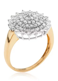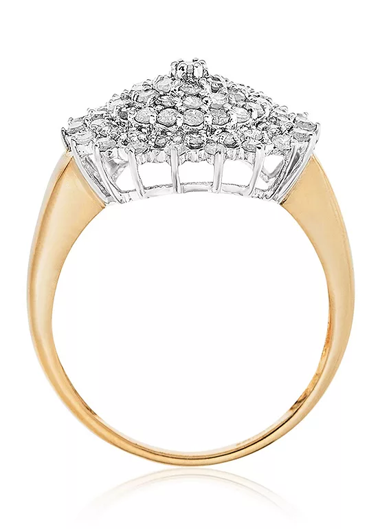 If youβre searching for statement jewellery, this beautiful round cluster dress ring would certainly add style to any outfit. Totalling 1 carat of diamonds, this sparkly glitter-bomb has been set on a 9 carat gold band, which compliments the diamonds beautifully. This striking piece offers the wow factor making it an ideal gift for your someone special. 9ct. Totalling 1 carat of diamond. Presented in a Gift Box.
