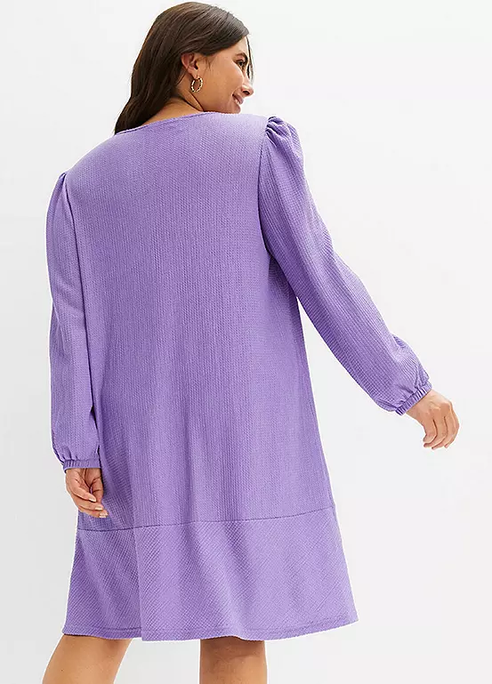 Long sleeve dress with ties at the roundneck and an A-line shape. 98% Polyester, 2% Elastane. Length approx. 94 cm.