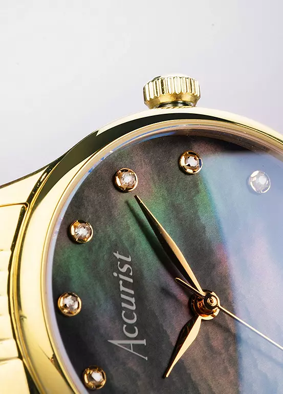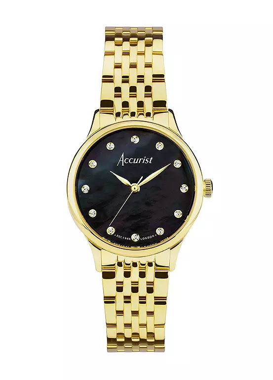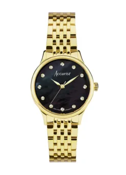 This watch has a gold ion-plated, solid stainless steel case enclosing a stone set, a black Mother-of-Pearl dial protected by scratch-resistant sapphire crystal glass.