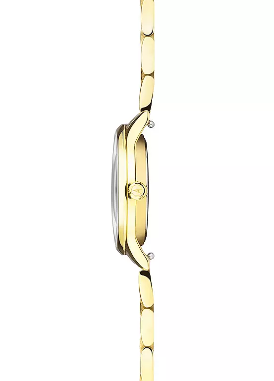 The watch is fastened with an interchangeable gold ion-plated, solid stainless steel bracelet and is water resistant up to 50 meters.