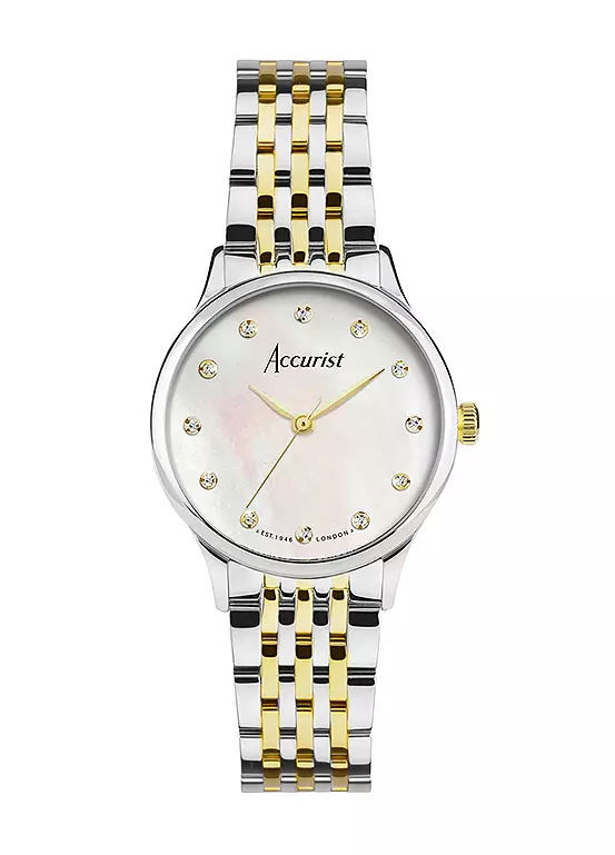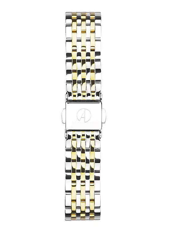 The watch is fastened with an interchangeable, two-tone, gold and silver ion-plated solid stainless steel bracelet and is water resistant up to 50 meters.