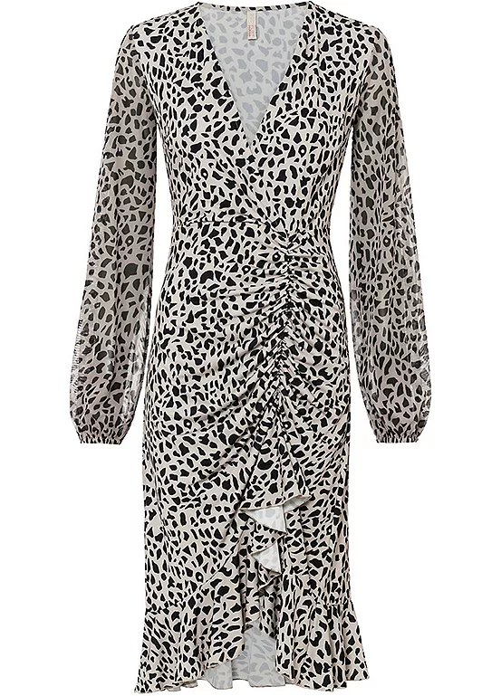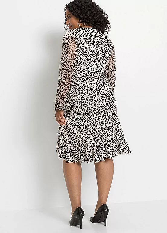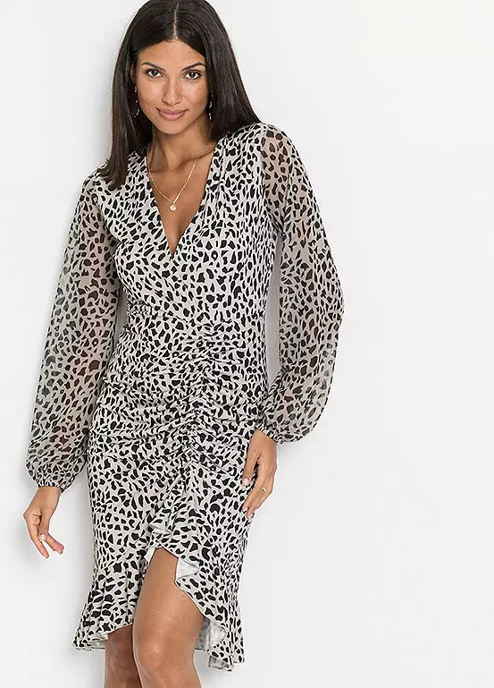 Animal print jersey dress with net sleeves. Machine washable. 95% Polyester, 5% Elastane. Length approx. 108 cm.