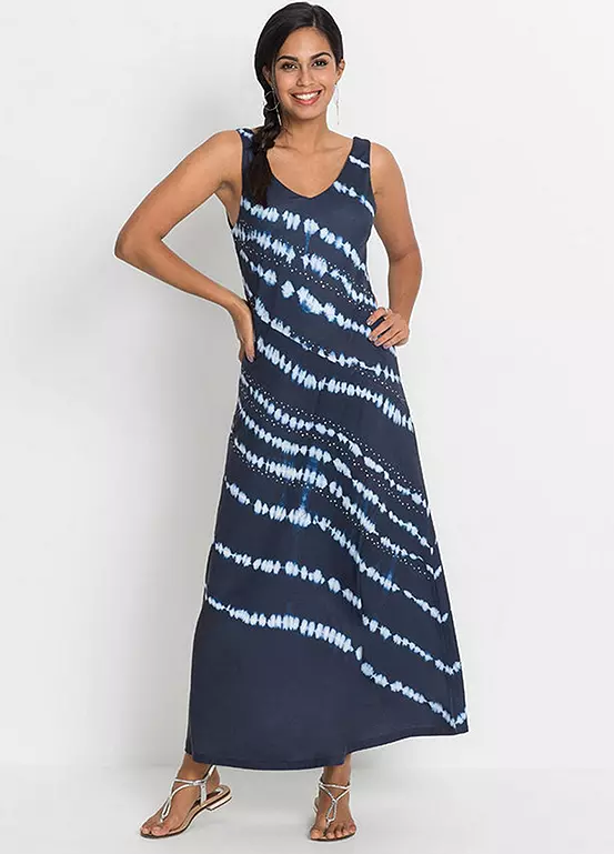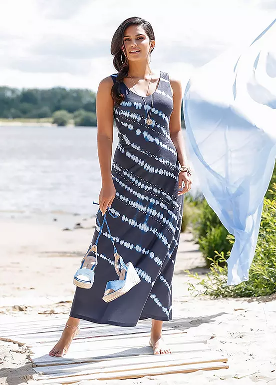 A sleeveless maxi dress with batik stripes and sparkling gemstones. Machine washable. 95% Polyester, 5% Elastane. Length approx. 140 cm.