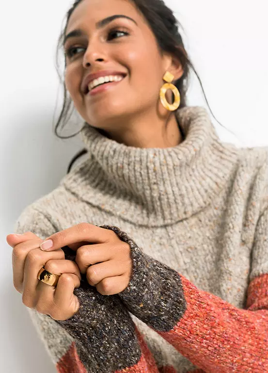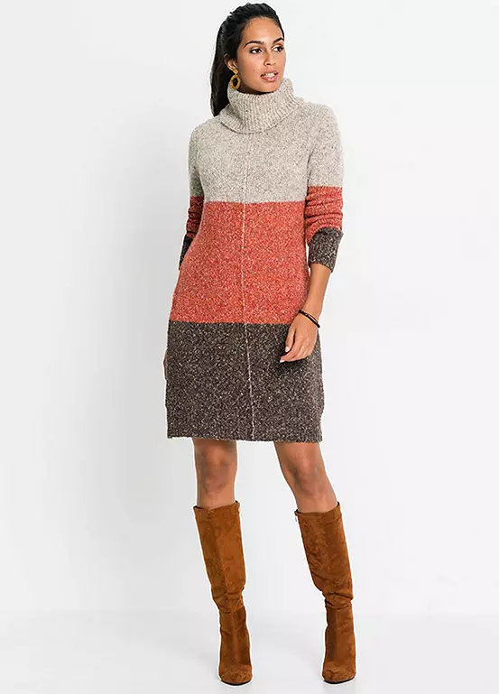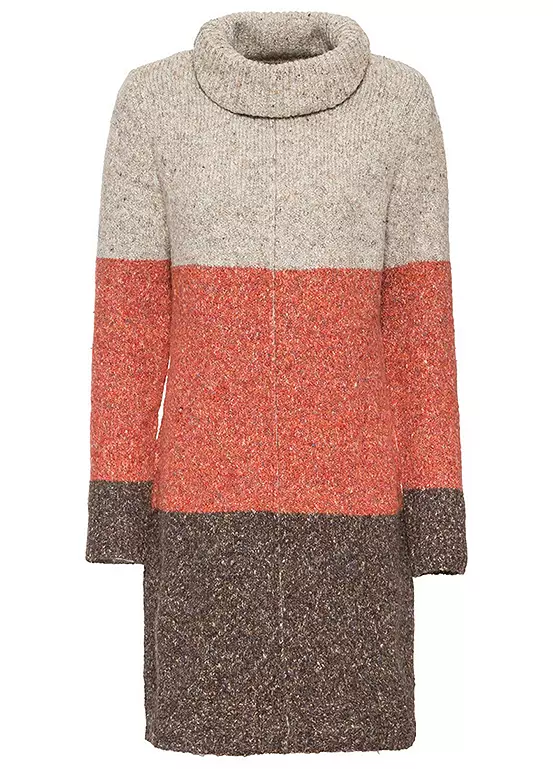 A polo neck dress in a marl knit with wide block stripes. Machine washable. 52% Polyester, 22% Acrylic, 19% Cotton, 6% Wool, 1% Elastane. Length approx. 90 cm.