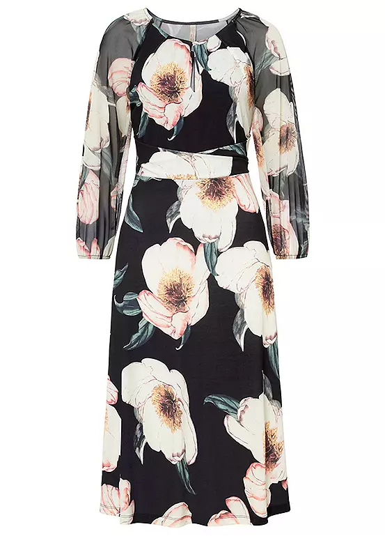 Printed midi dress with sheer net sleeves. Length approx. 114 cm.