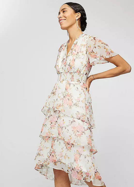 Chiffon shell dress with a floral pattern and flouncing. Length approx. 120 cm.