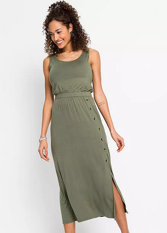 A summery sleeveless midi dress with a button panel on the skirt part. Machine washable. Length approx. 126 cm.