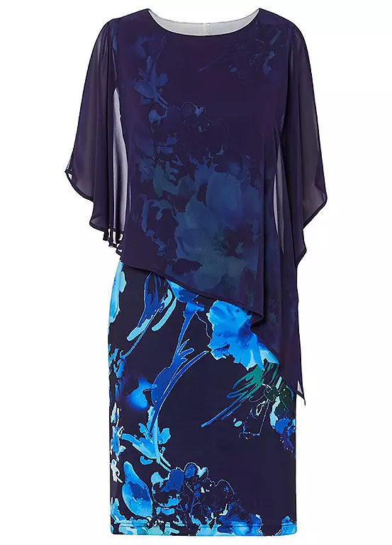 Floral print shift dress with a chiffon throw around the bodice. Length approx. 94 cm.