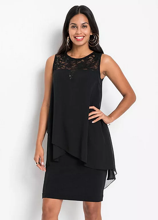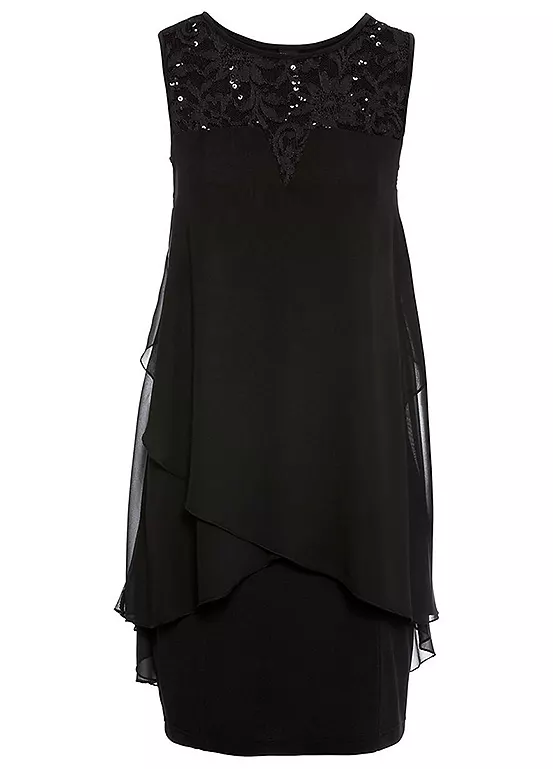 This sleeveless jersey dress has a sheer chiffon shell that falls loosely around your upper body. A lace yoke and tiny sparkling sequins leave it looking party-ready. Machine washable. Shell: 95% Polyester, 5% Elastane, Trim: 100% Polyester, Lace: 58% Polyamide, 40% Polyester, 2% Elastane. Length approx. 90 cm.