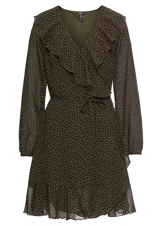 A dotted wrap-look chiffon dress with flounces. Machine washable. Length approx. 90 cm.