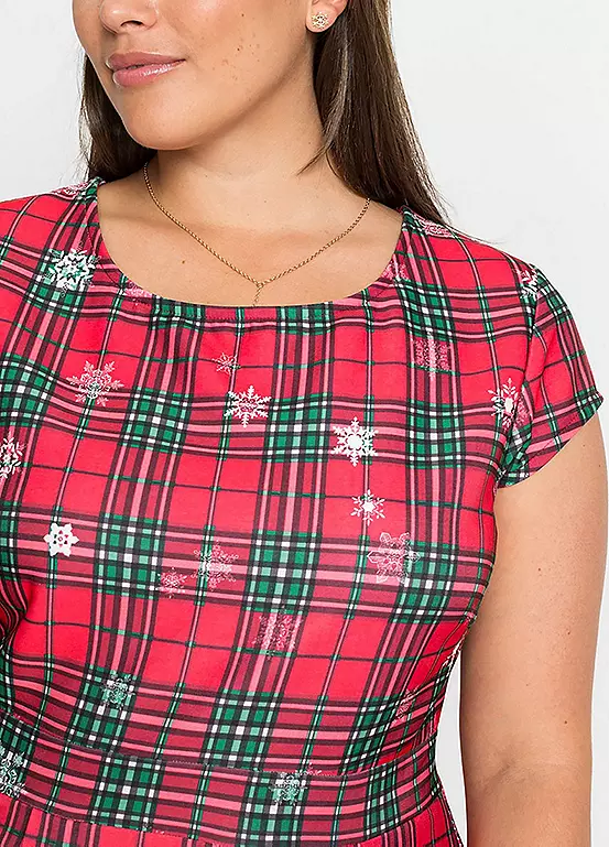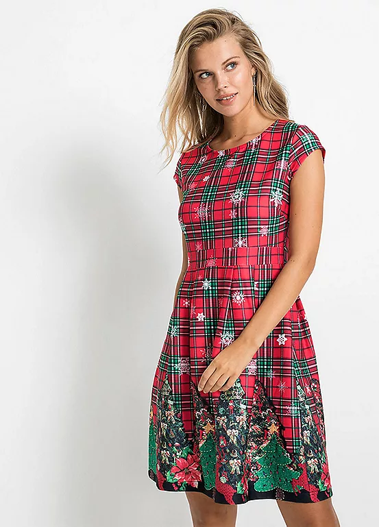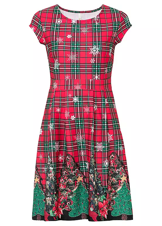 Tartan print dress with Christmas prints. Machine wash. Length approx. 94 cm.
