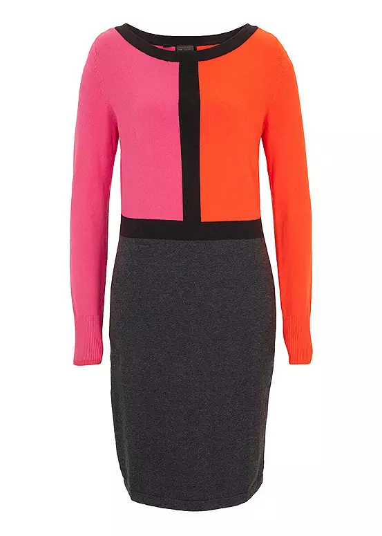 Elegant knitted dress with a colour blocking design, round neck and long sleeves. Length approx. 94 cm.