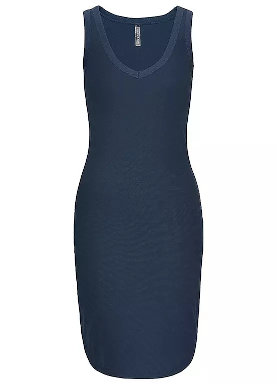 A ribbed bodycon dress with a v-neck and a rounded hem. Machine washable. 49% Cotton, 49% Polyester, 2% Elastane. Length approx. 94 cm.