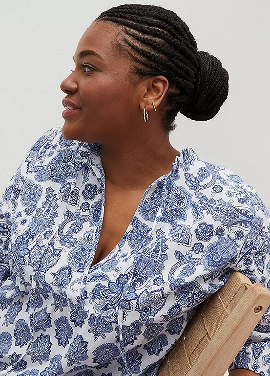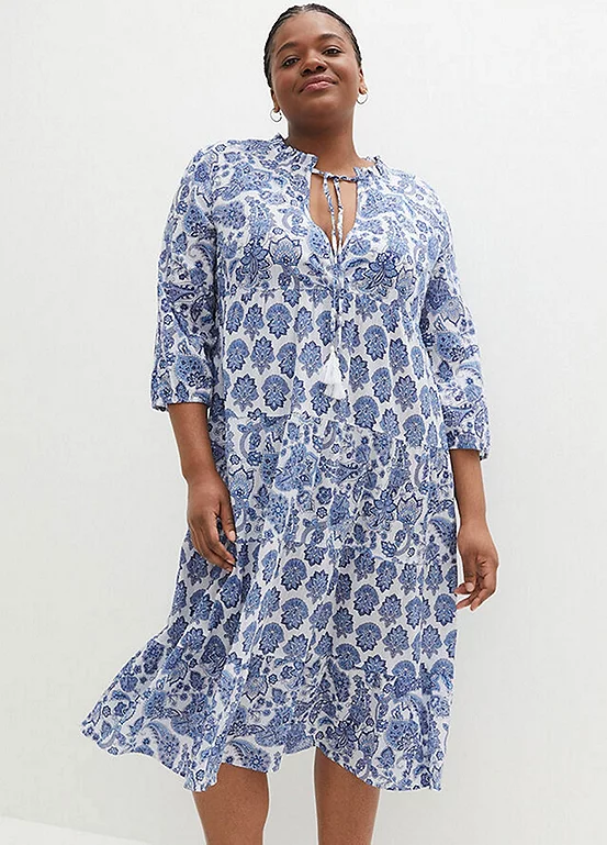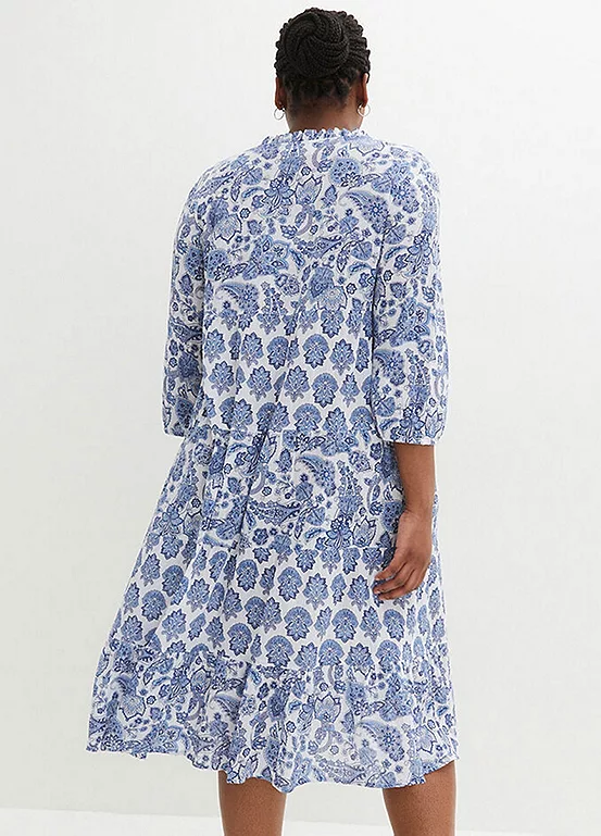 Paisley print midi dress in crushed cotton with a frilly collar. Washable. Length approx. 120 cm.