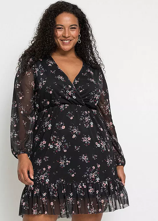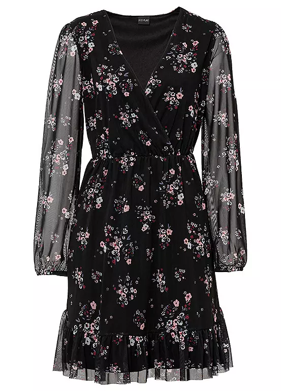 Floral skater dress with sheer net sleeves. Machine washable. Shell: 96% Polyester, 4% Elastane. Lining: 100% Polyester. Length approx. 94 cm.