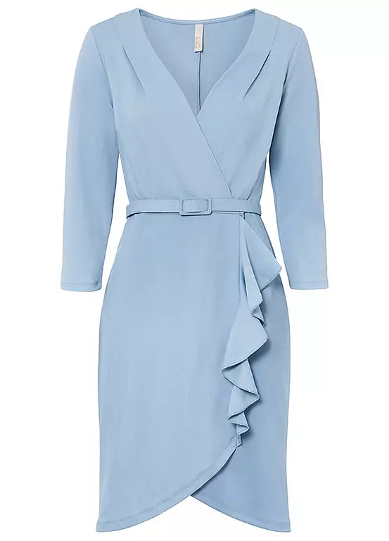 Plunging wrap dress with flouncing and waist ties. Length approx. 94 cm.