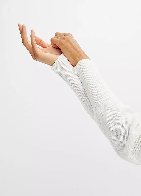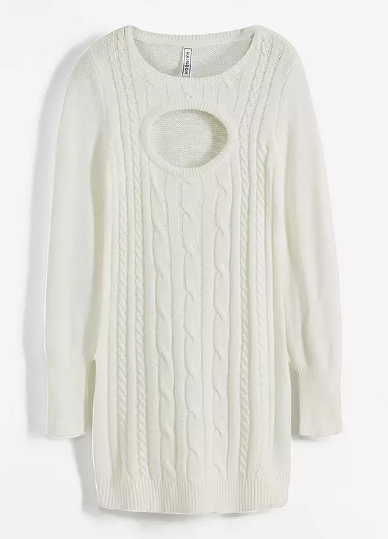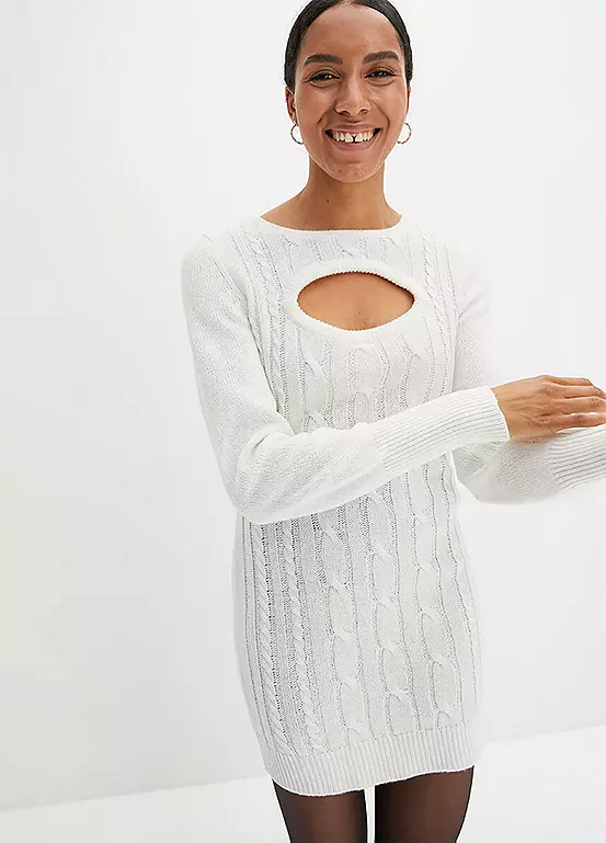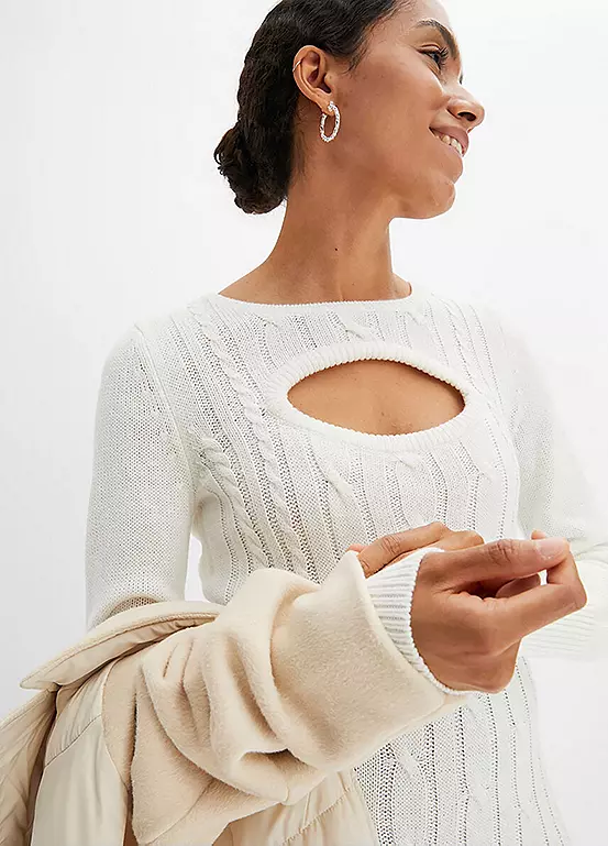 Crew neck knitted dress with a cut-out and a classic cable pattern. Machine wash. Length approx. 86 cm.