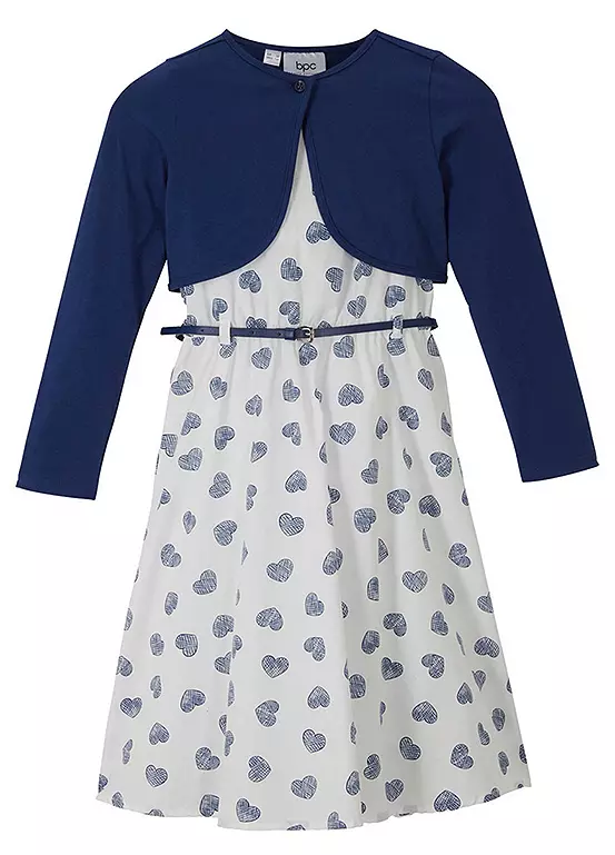 A heart print jersey dress with a matching bolero and belt. Machine washable. Dress & Bolero: 100% Cotton. Belt: 100% PU.
