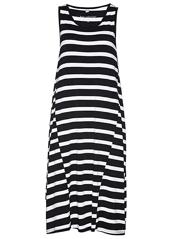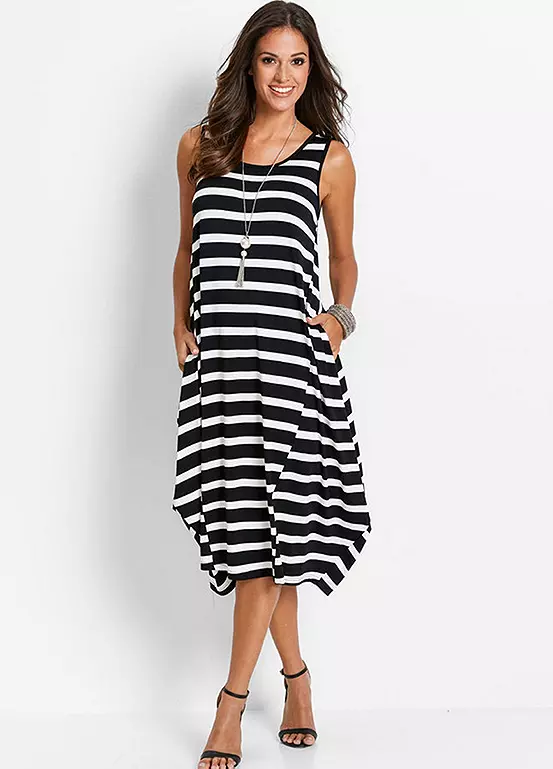 A sleeveless jersey dress with a swinging hanky hem. Machine washable. 95% Viscose, 5% Elastane. Length approx. 108 cm.