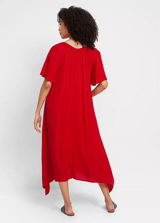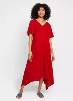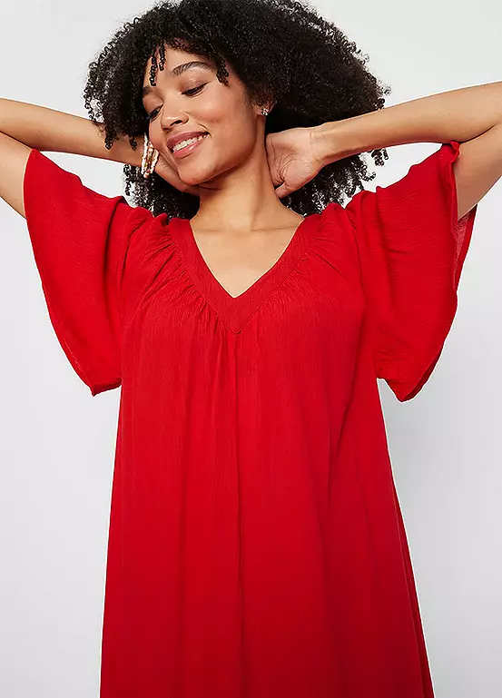 Sweeping V-neck dress in crepe material. Washable. Length approx. 126 cm.