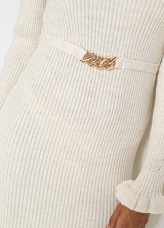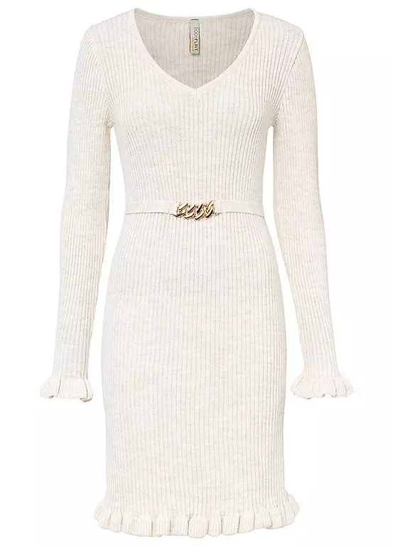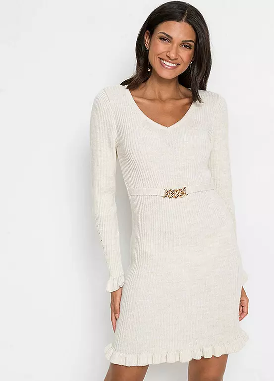 A fashionable V-neck knit dress with a belt. Length approx. 90 cm.