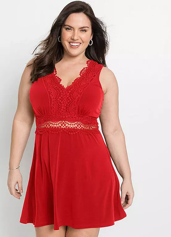 A short dress with floral lace trim. 95% Polyester, 5% Elastane. Length approx. 86 cm.