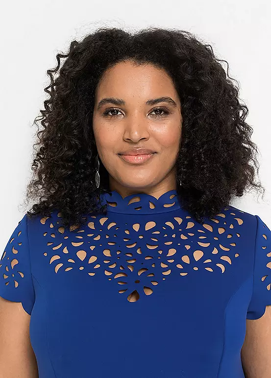 A fitted shift dress with a laser cut bodice. Machine washable. Length approx. 94 cm.
