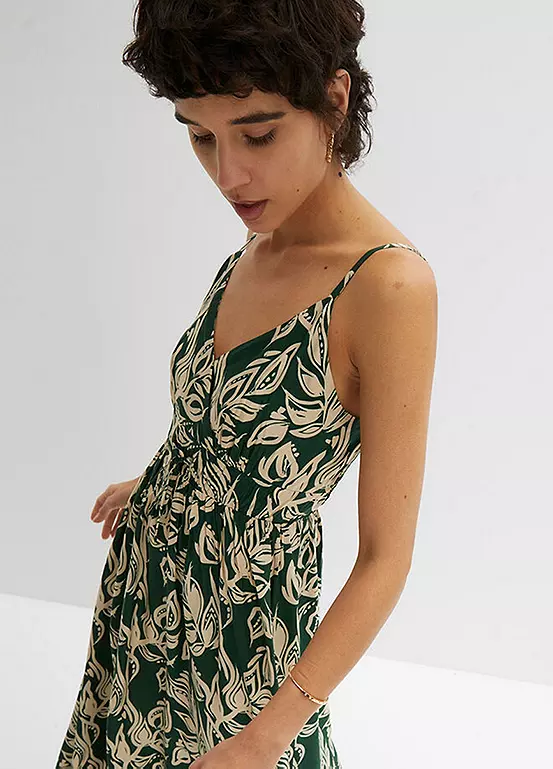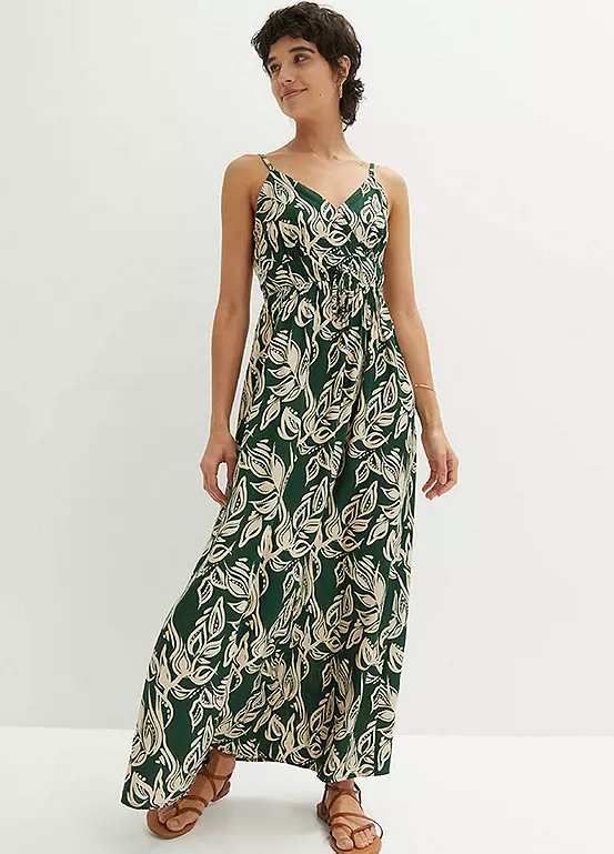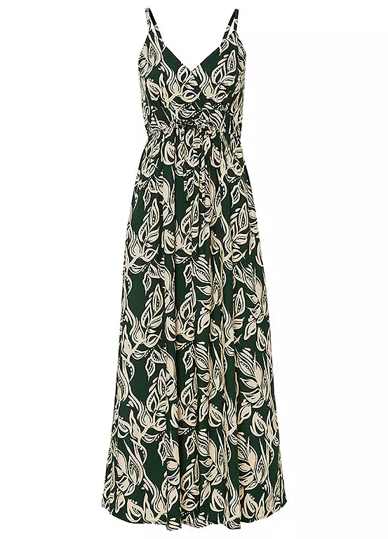 Leaf print maxi dress with slim cami straps and smocking at the back. Length approx. 136 cm.