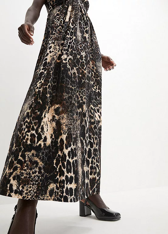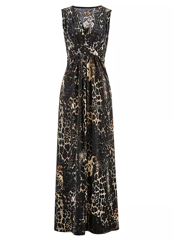 An animal print dress with a fitted bodice and a loose, ankle length skirt. Machine washable. 95% Polyester, 5% Elastane. Length approx. 136 cm.