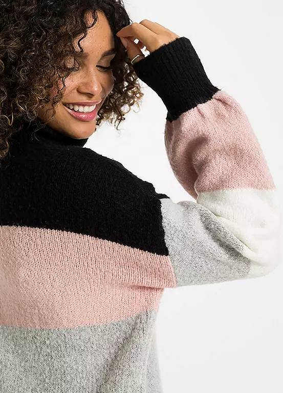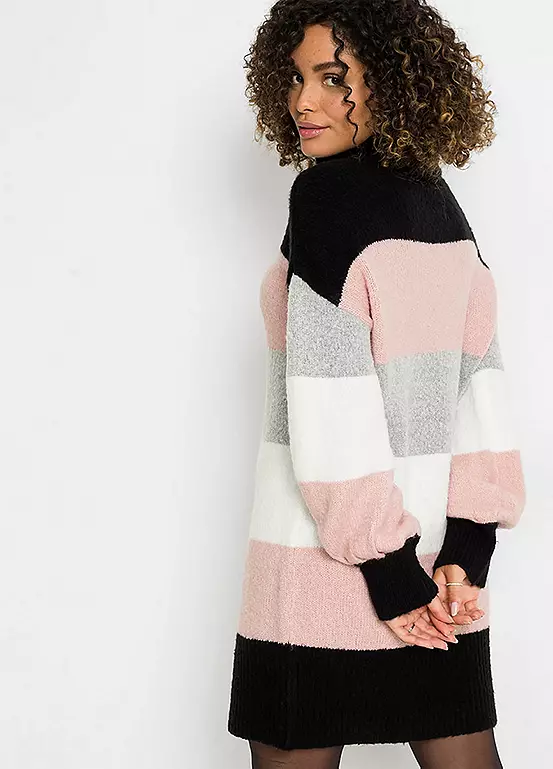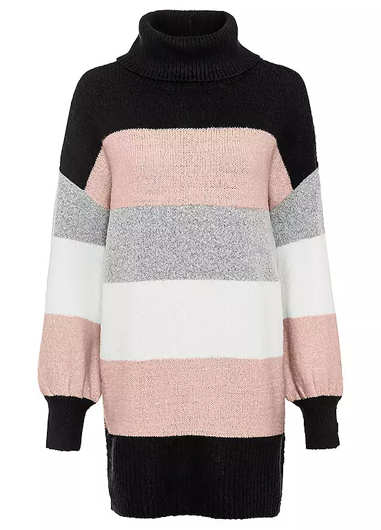 An extra long jumper with puff sleeves, a polo neck collar and a fashionable striped pattern. 75% Acrylic, 22% Polyester, 3% Elastane. Length approx. 82 cm.