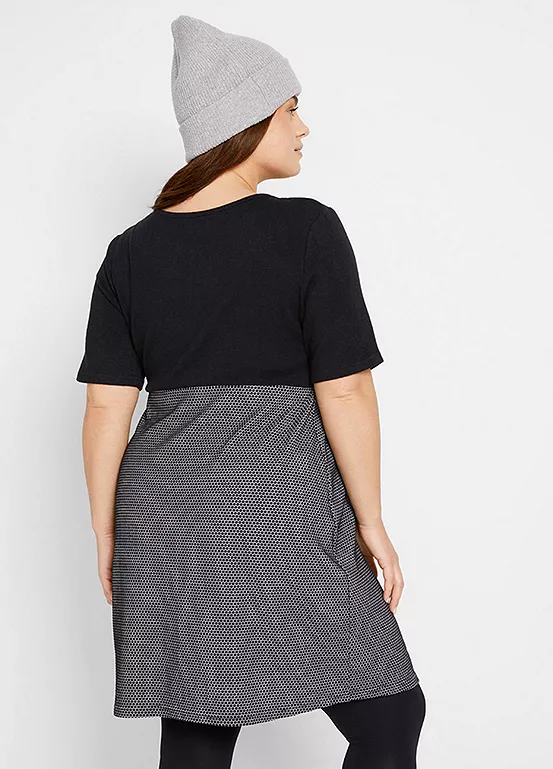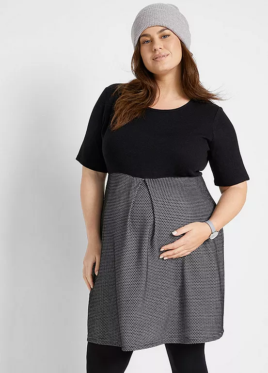 A short sleeve dress with a printed skirt that has a pleat to allow ample room for your changing shape. Machine washable. Shell: 96% Acrylic, 4% Elastane, Loose Shell: 100% Polyester. Length approx. 92 cm.