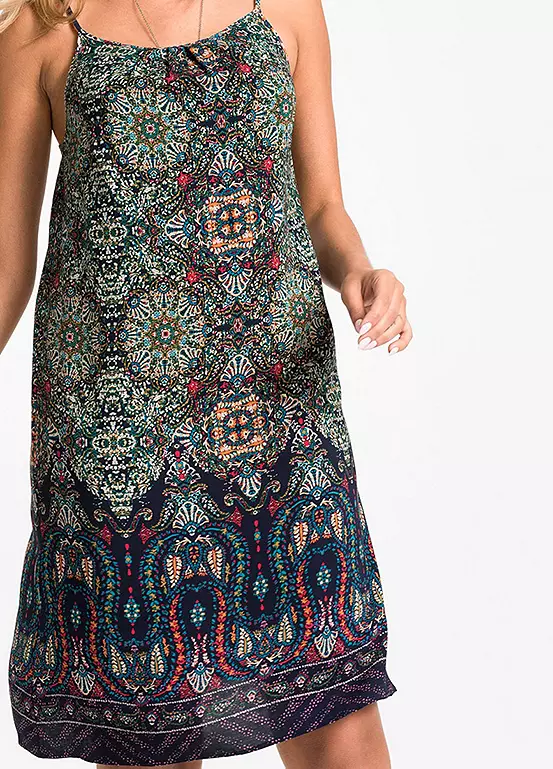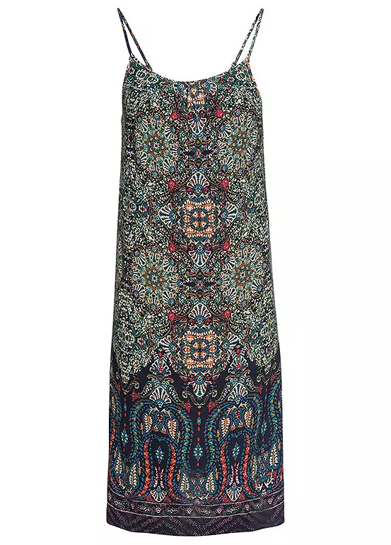 A printed summer dress with adjustable cami straps. Machine washable. 100% Viscose. Length approx. 98 cm.