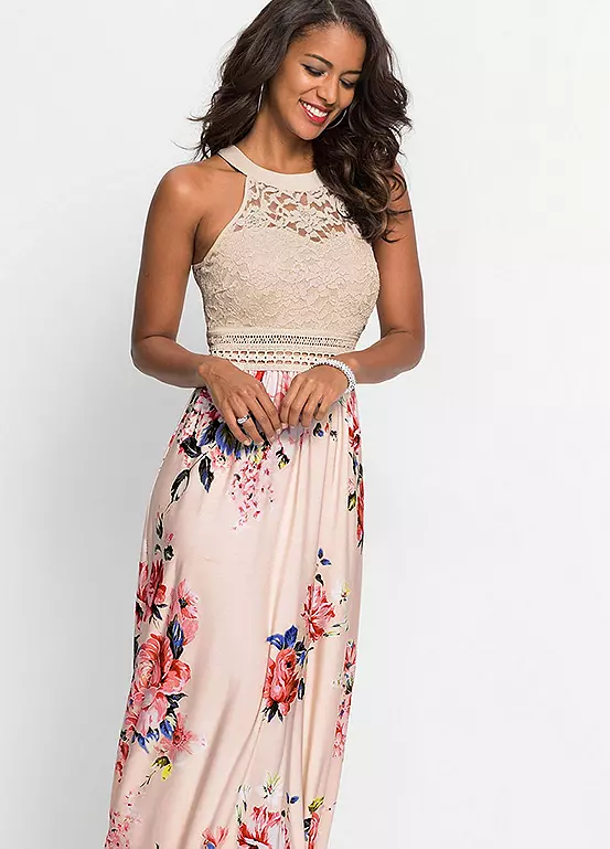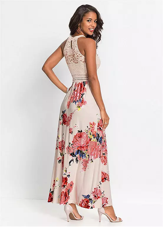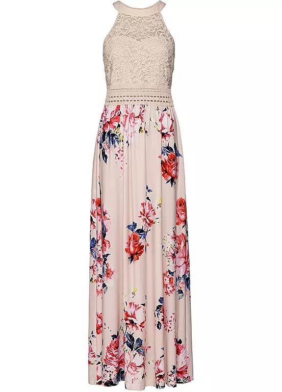 A posy print dress with a lace bodice. Machine washable. Length approx. 128 cm.