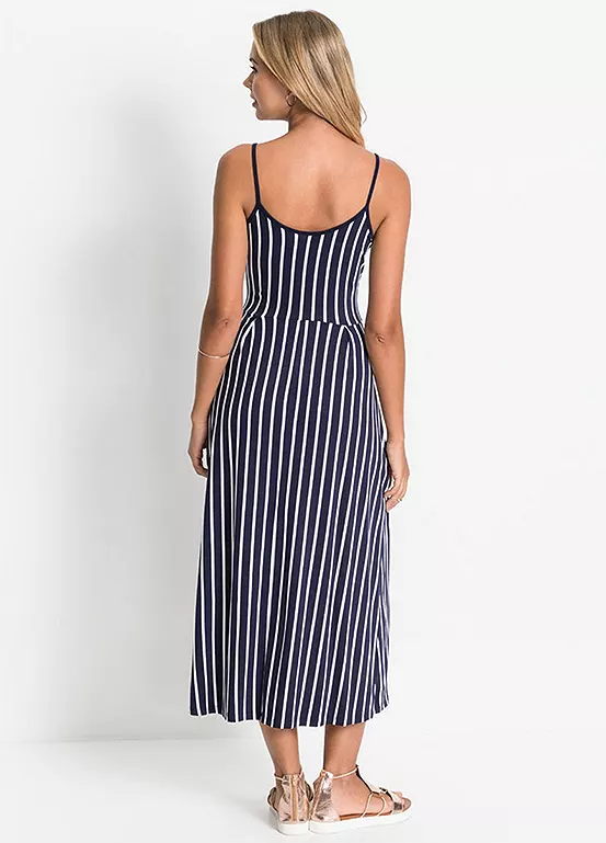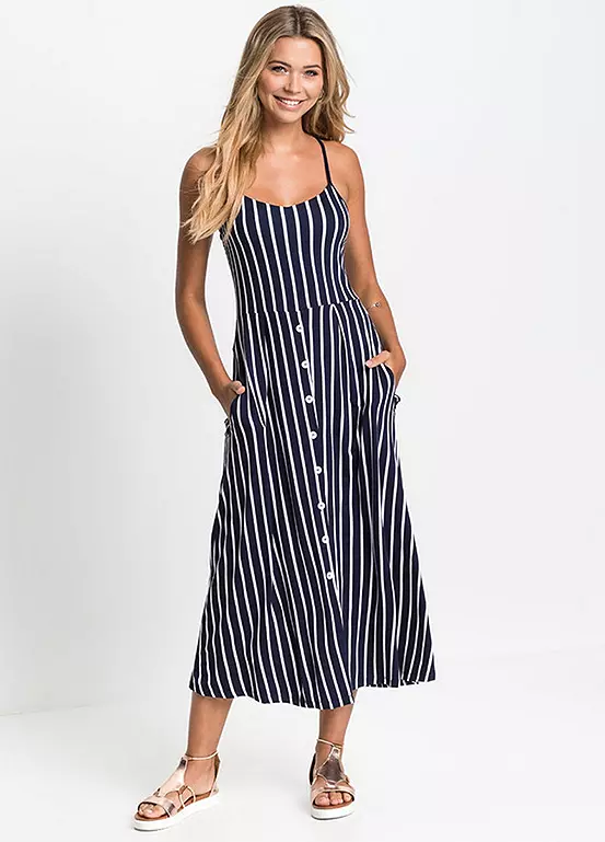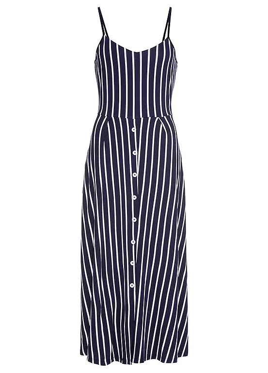 A cami strap summer dress with a pinstripe pattern and buttoning down the front of the skirt. Machine washable. 95% Viscose, 5% Elastane. Length approx. 120 cm.