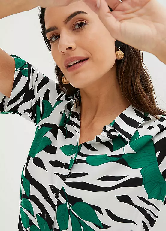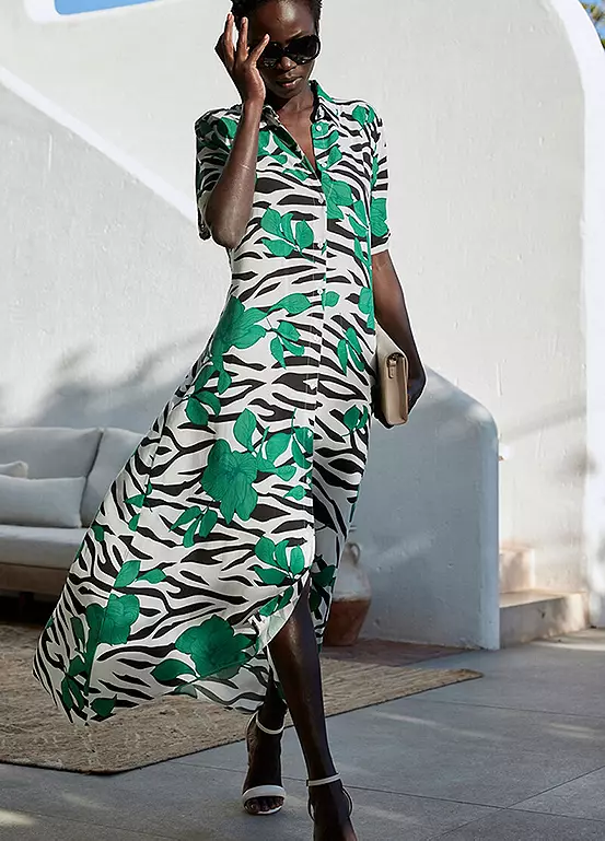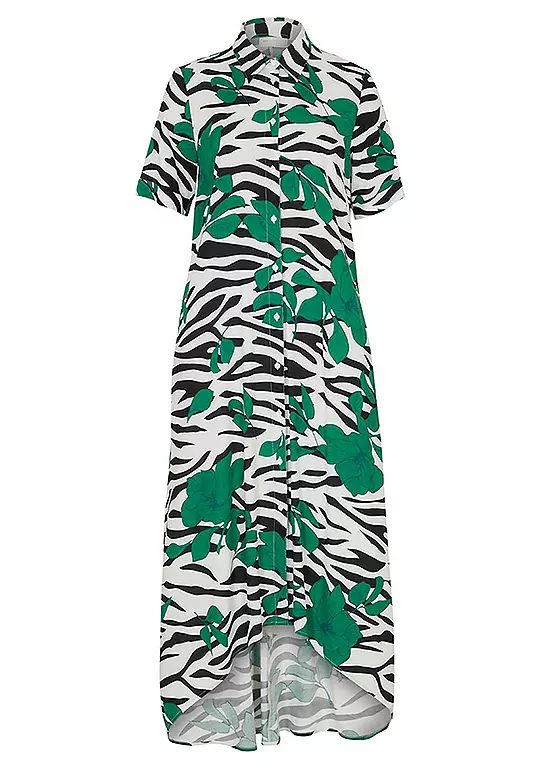 Short sleeve shirt dress with animal stripes and flowers. Machine washable. 100% Sustainable Viscose. Length approx. 136 cm.