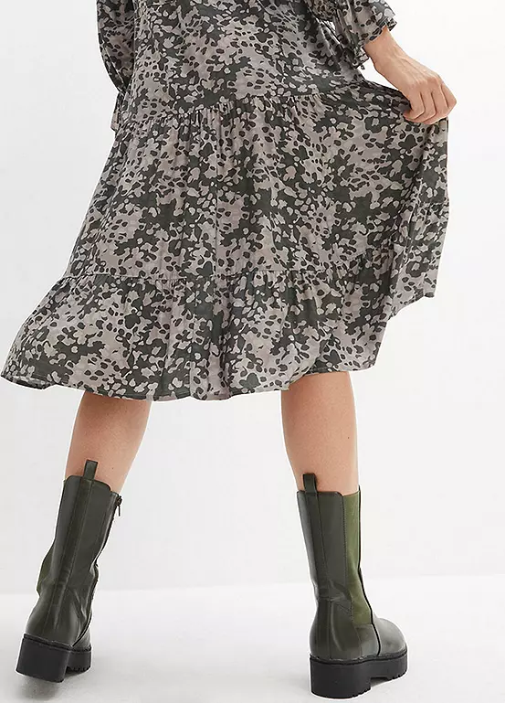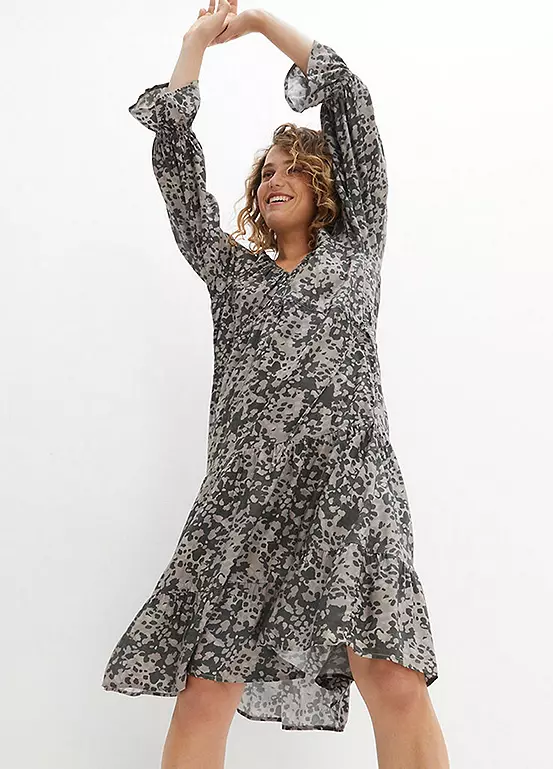 Chiffon shell dress with a V-neck bodice and a flounced hem. Machine washable. 100% Sustainable Viscose. Length approx. 108 cm.