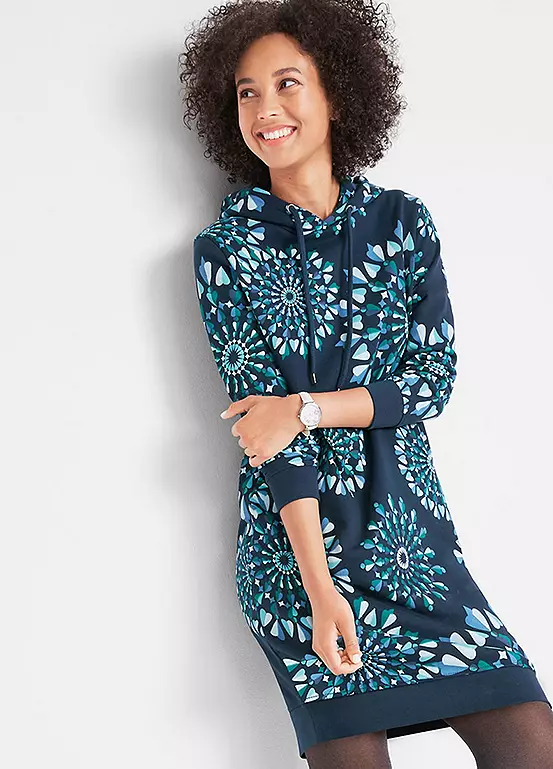 Comfortable sweatshirt dress featuring long sleeves and an all-over print. Machine washable. 100% Cotton. Length approx. 92 cm.