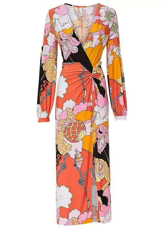 Brightly printed dress with a wrap bodice and ruching at the waist. Length approx. 136 cm.