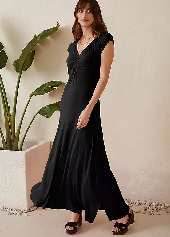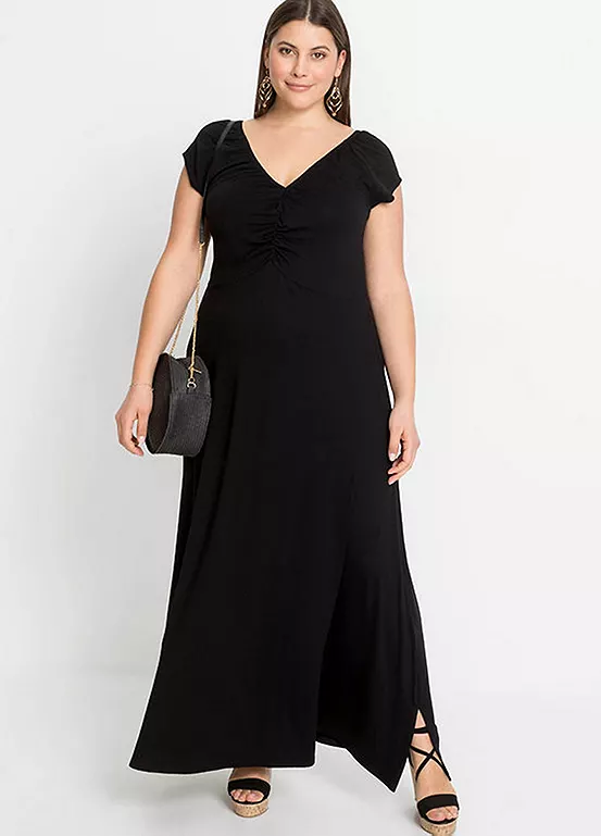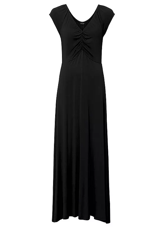 Ruched dress with a low cut V-neck. 140 cm.