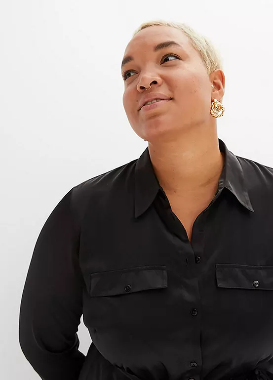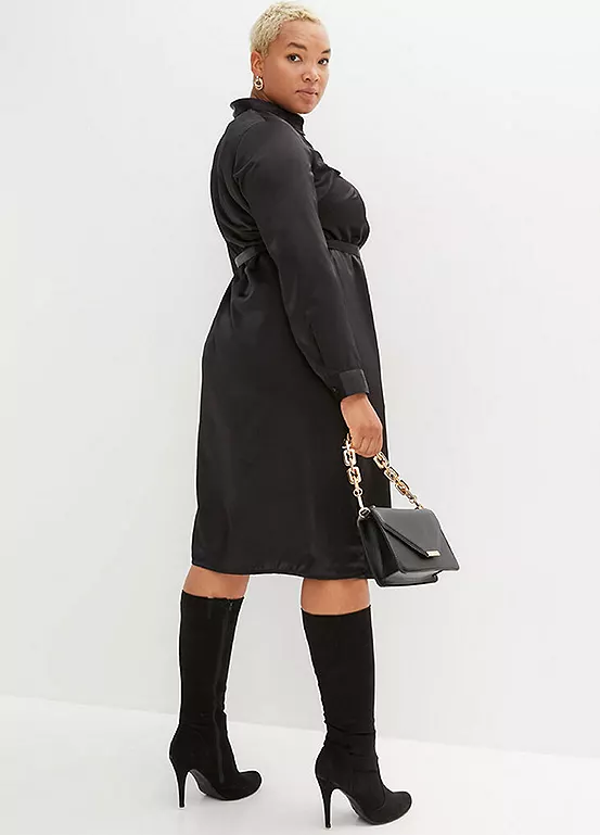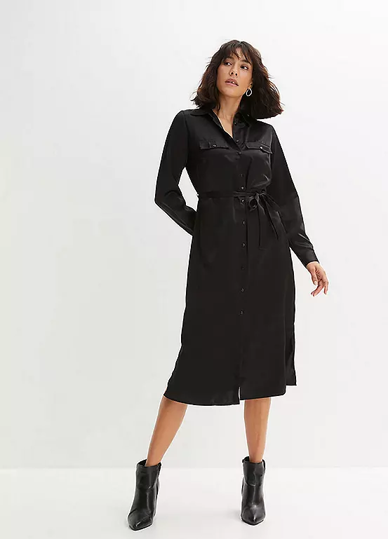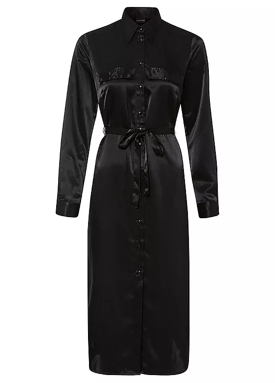 Glossy dress with buttoning and tie at the waist. Machine wash. Length approx. 114 cm.