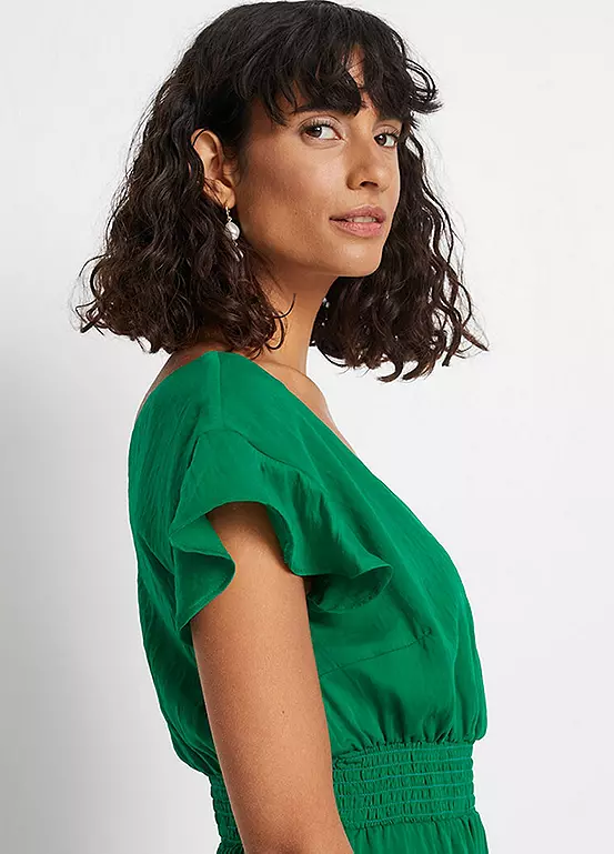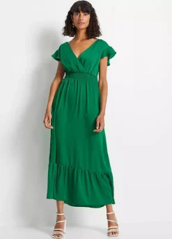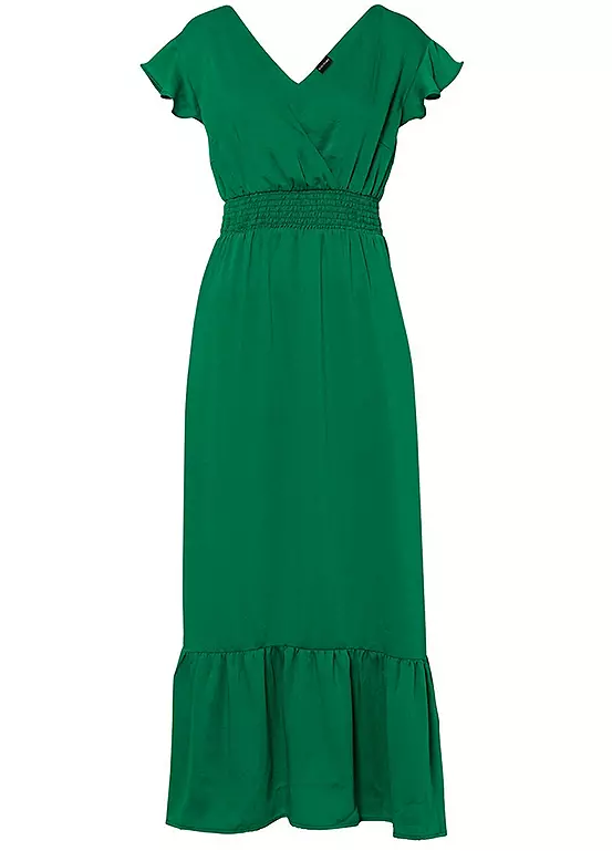 A long satin dress with a wrap bodice. Machine washable. Length approx. 136 cm.