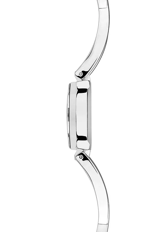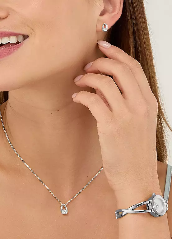 This gift set features a watch paired with matching silver plated, stone set pendant and earrings. The watch has a round, stone set, silver ion-plated alloy case housing a silver-white dial. Fastened with a silver ion-plated alloy, semi bangle bracelet with a jewellery clasp. Gift set. Silver white semi-matte dial mirror edge glass. Silver ion plated alloy round 22 mm case. Silver ion plated alloy semi-bangle. mineral glass. Silver hands. Japanese movement. 2 years guarantee. Strap width approx. 11 mm. Minimum strap length: 135 mm. Maximum strap length: 185 mm.
