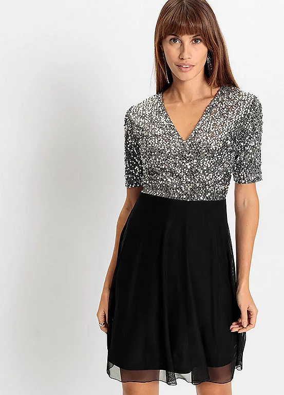 Stylish dress with a sparkling sequin bodice and a chiffon shell skirt. Machine wash. Length approx. 94 cm.