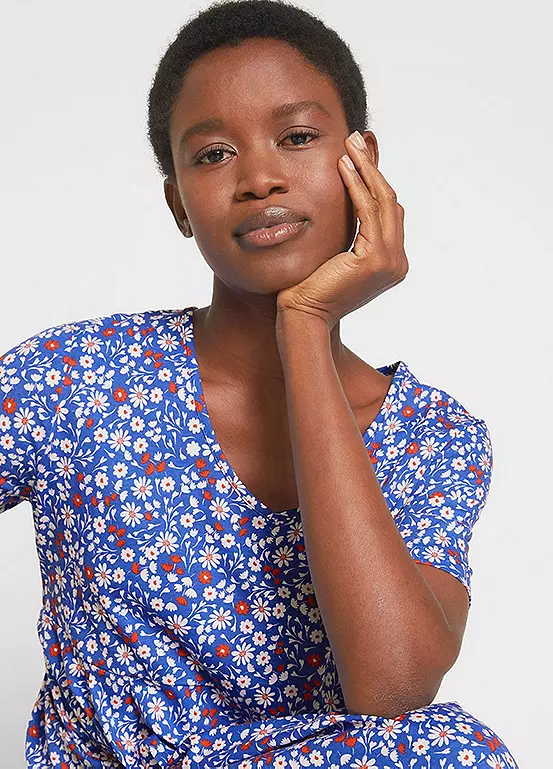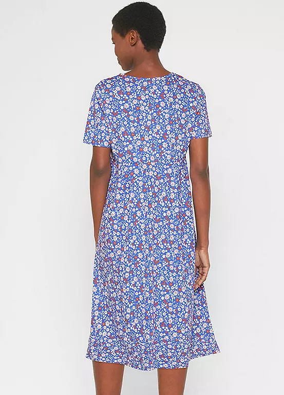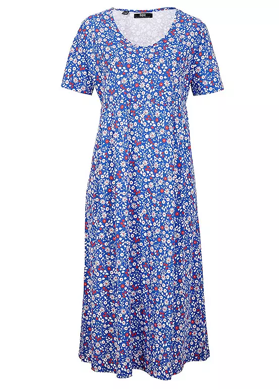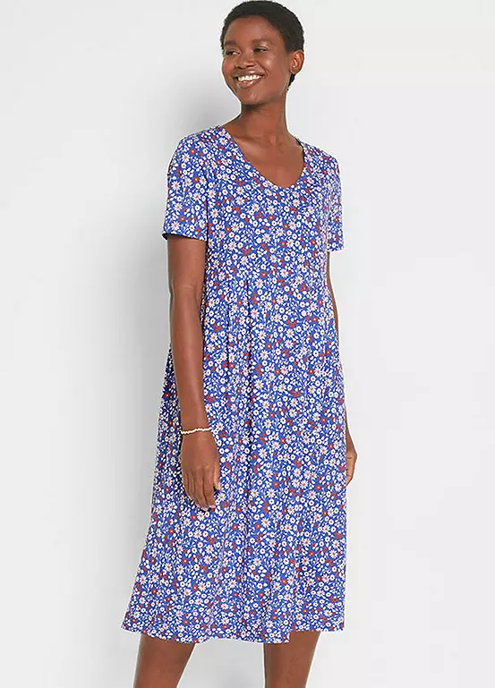 A floral printed jersey dress with a midi length skirt. Also available in a plain design. Machine washable. 100% Cotton. Length approx. 114 cm.