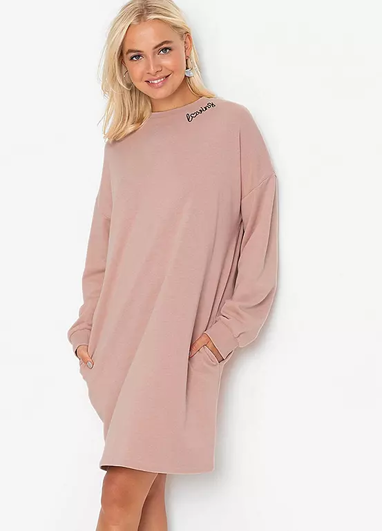 Casual sweatshirt dress with pockets and ’Loving’ embroidery on the shoulder. Length approx. 90 cm.