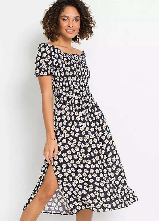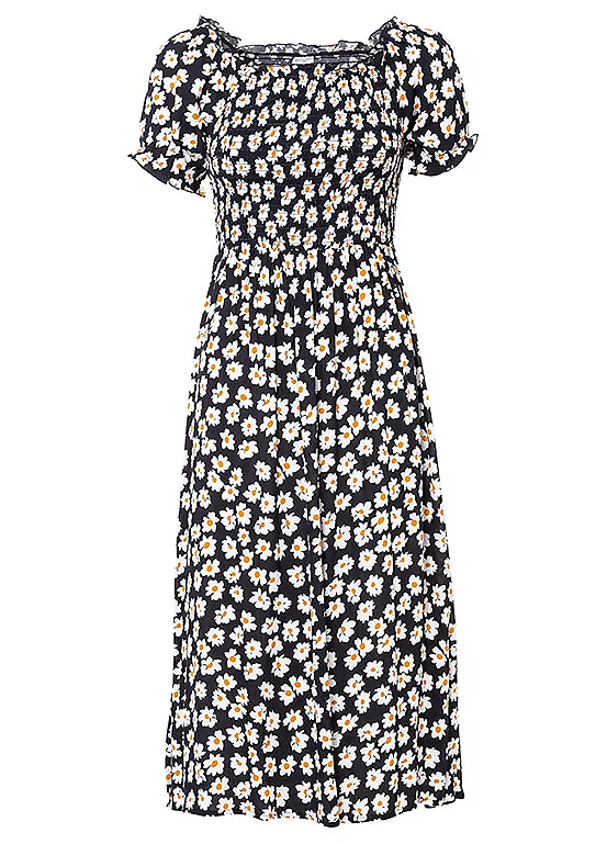 Floral print dress with a smocked bodice. Washable. Length approx. 109 cm.
