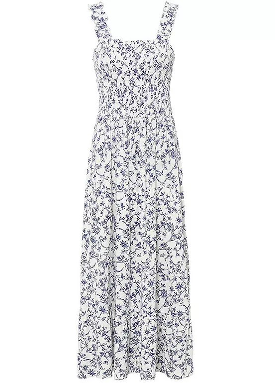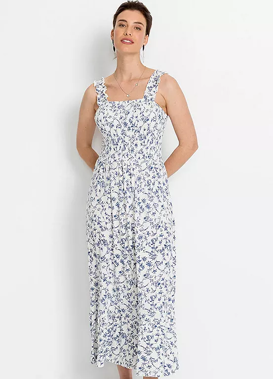 A sustainable viscose sun dress with smocking. 95% Viscose (Sustainable), 5% Elastane. Length approx. 120 cm.