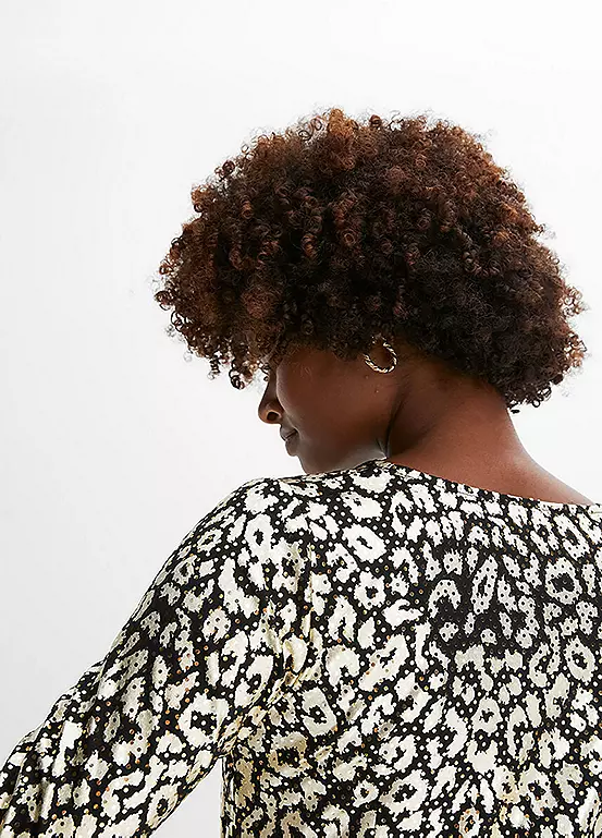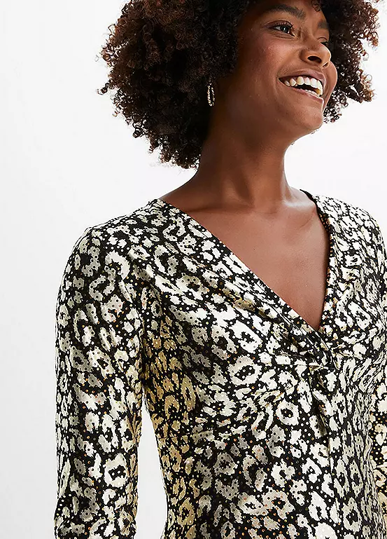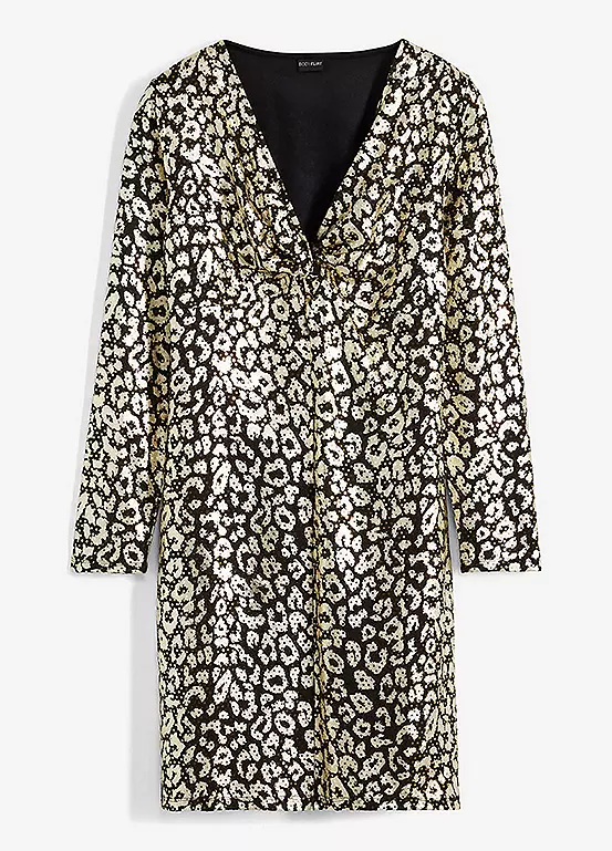 Fitted party dress with a V-neck and a sparkly animal print. Length approx. 94 cm.