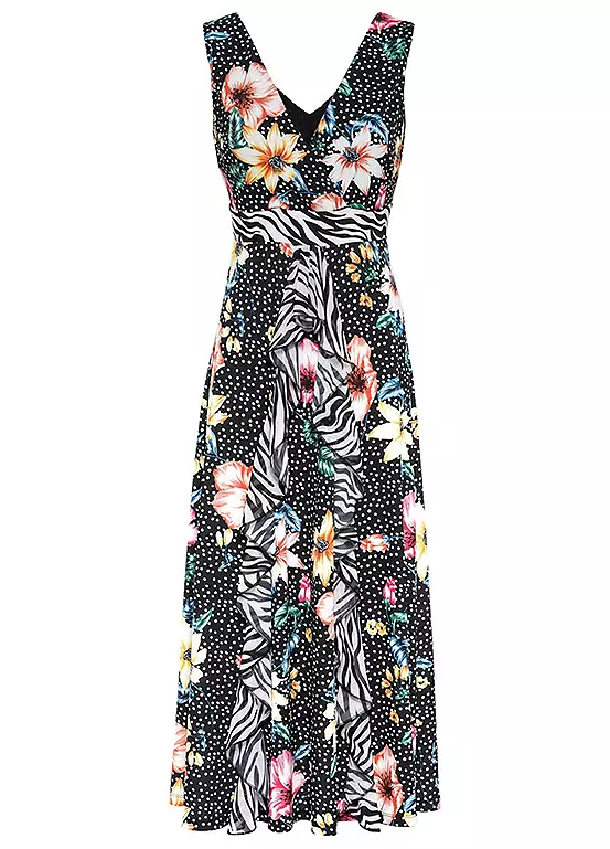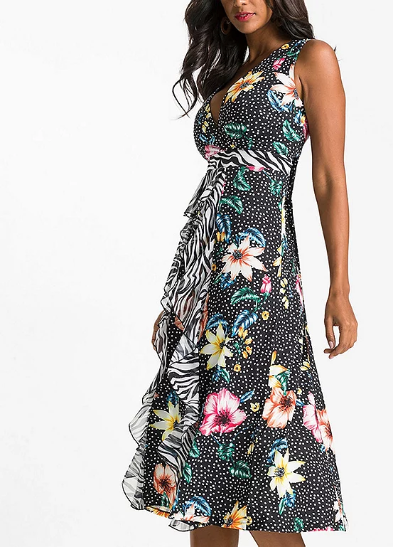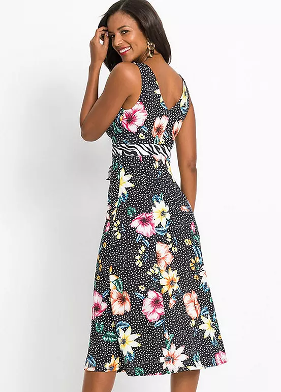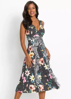 Plunging V-neck dress with a tropical print. Shell: 95% Polyester, 5% Elastane. Insert: 100% Polyester. Length approx. 120 cm.