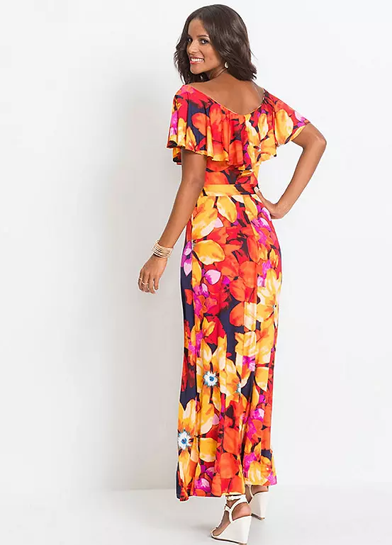 Floral print maxi with fluted sleeves. Length approx. 136 cm.
